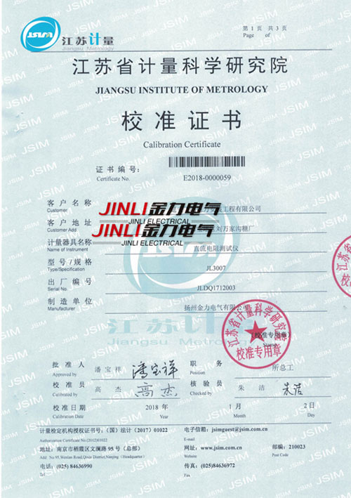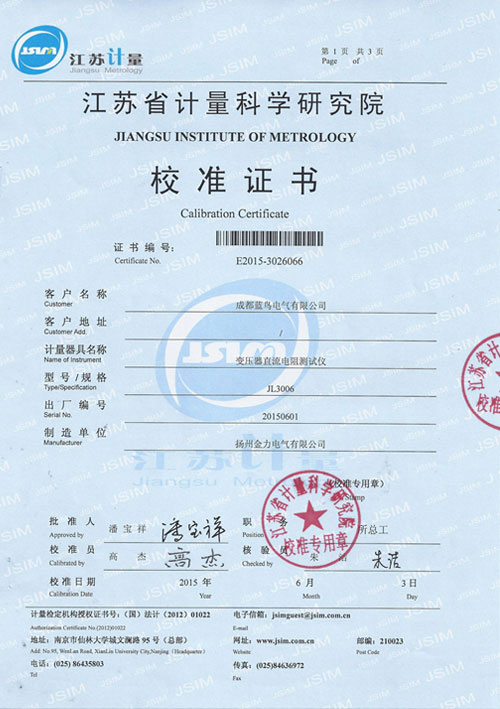 JL3007變壓器直流電阻測試儀-江蘇省計量科學(xué)研究院校準(zhǔn)證書