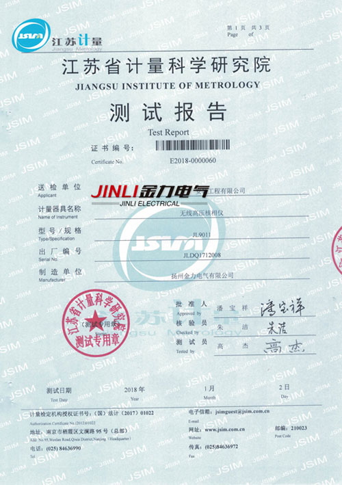 JL9011無線高壓核相儀-江蘇省計量科學(xué)研究院校準(zhǔn)證書