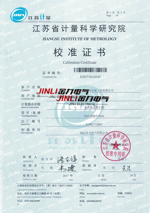 ZGF-200KV/5mA直流高壓發(fā)生器-江蘇省計量科學(xué)研究院校準(zhǔn)證書