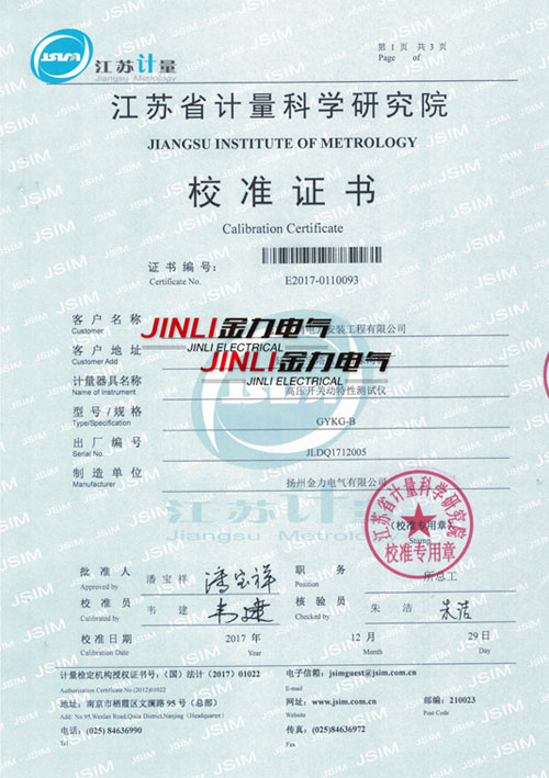 GYKG-B高壓開關(guān)動特性測試儀-江蘇省計量科學(xué)研究院校準(zhǔn)證書