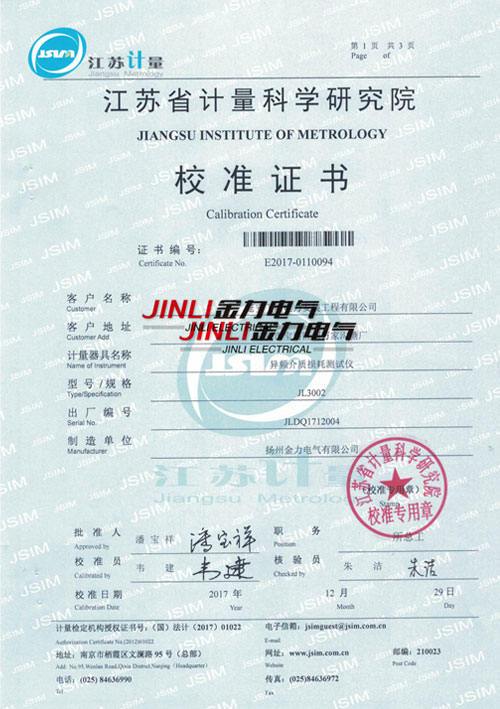 JL3002異頻介損耗測試儀-江蘇省計量科學(xué)研究院校準(zhǔn)證書