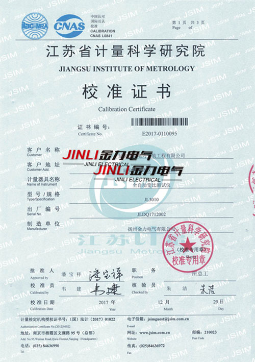 JL3010全自動變比測試儀-江蘇省計量科學(xué)研究院校準(zhǔn)證書