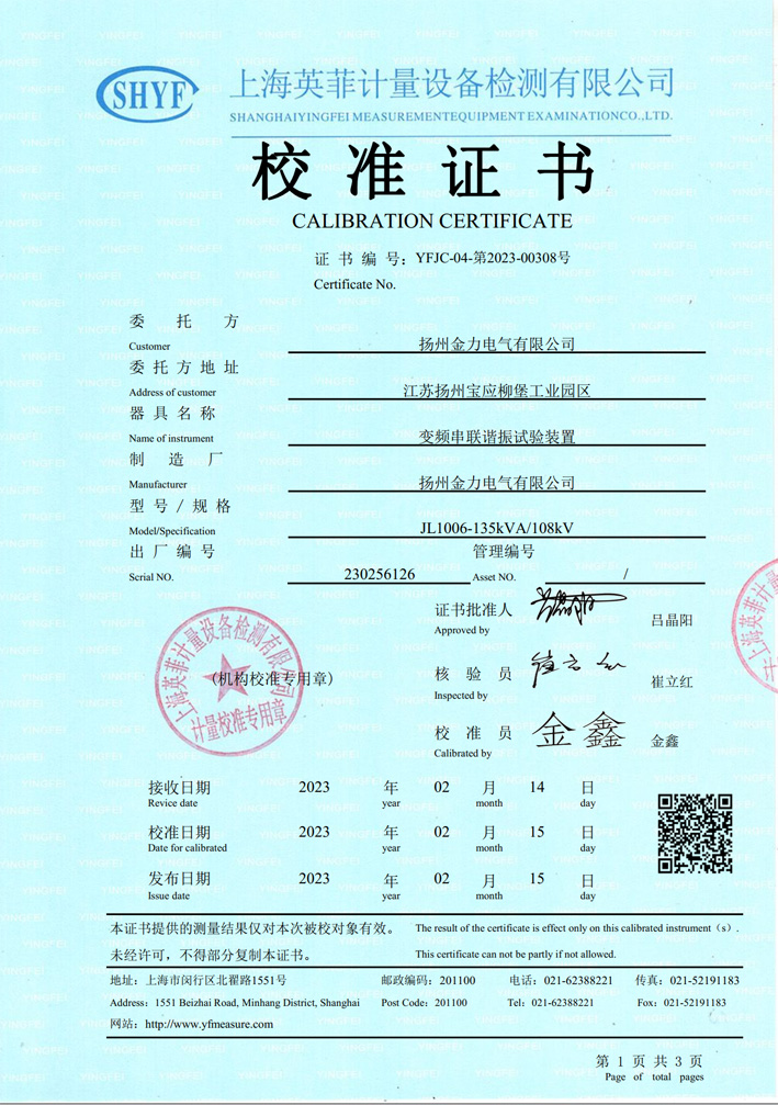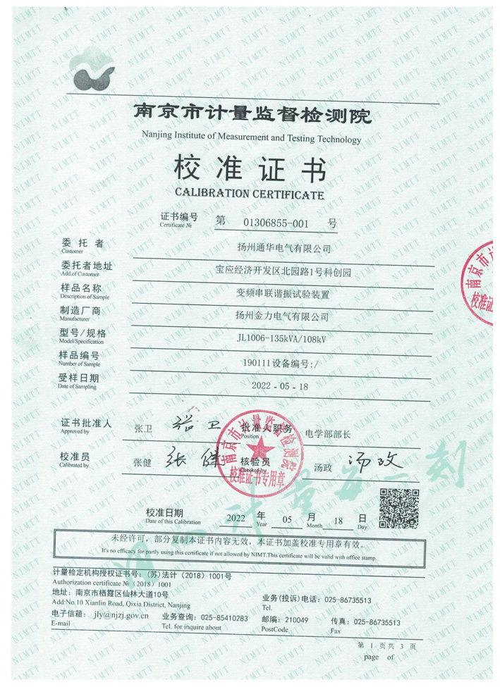 JL1006-135KVA/108KV變頻串聯(lián)諧振試驗裝置校準(zhǔn)證書