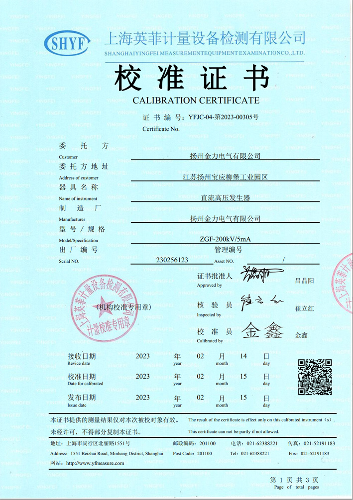 ZGF-200KV/5mA直流高壓發(fā)生器校準(zhǔn)證書
