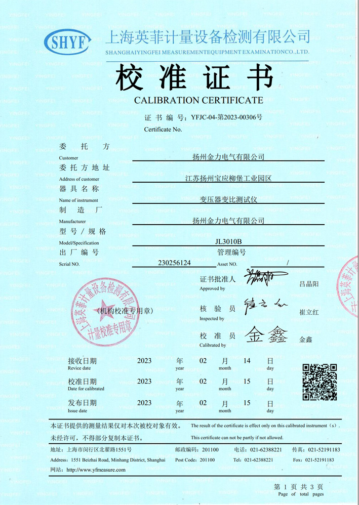JL3010B變壓器變比測試儀校準(zhǔn)證書