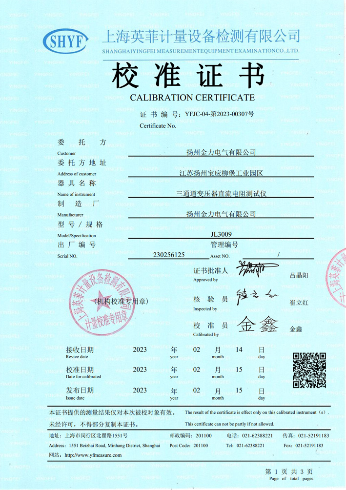 JL3009三通道變壓器直流電阻測試儀校準(zhǔn)證書